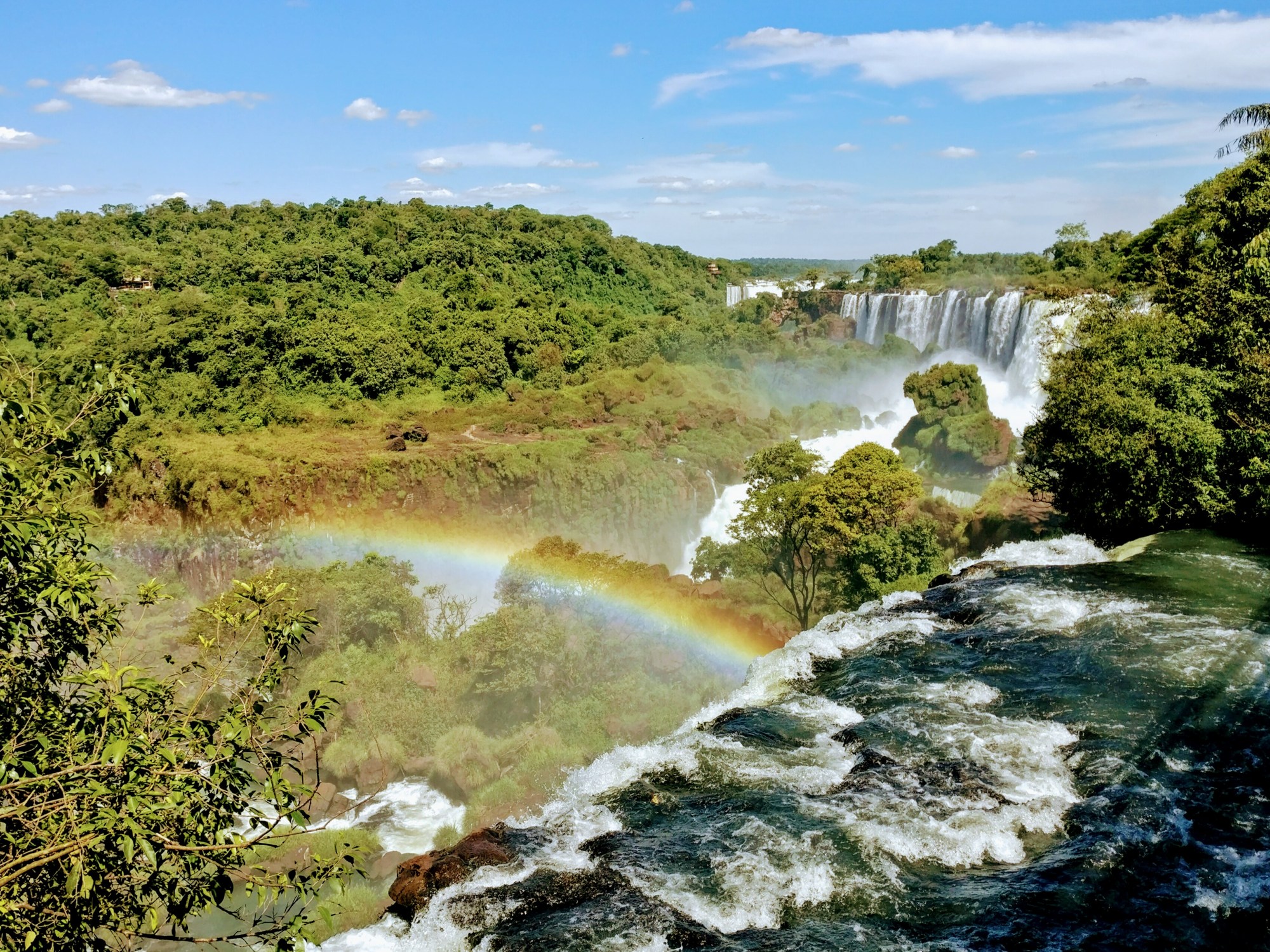 Wieder gut gesättigt und um ein paar lustige Schreckreaktionen bereichert, gehe ich den vorletzten Weg des Nationalparks an. Dieser führt nach oben und ermöglicht einem die ganze Länge der Fälle zu sehen. Wenn man kurz vorm Abgrund auf einer Brücke steht ist man von einer unglaublich friedlichen Ruhe umgeben. Das Wasser plätschert vor sich hin und man erwartet bei dieser Stille nicht, dass es nur wenige Meter weit nach unten geht. Das Beste am Höhenweg ist allerdings nicht die hervorragende Aussicht, sondern die Regenbögen. Mit Hilfe des aufsteigenden Dunstes zaubert die Sonne mir den nächstgelegensten Regenbogen den ich in meinem ganzen Leben gesehen habe. Ich kann zwar nicht mehr nachvollziehen, was genau ich in folgendem Video sagen wollte, aber ich bin mir sicher, dass es genau darum ging.