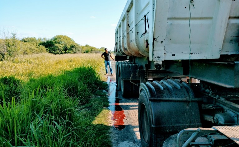 Nachdem wir schon ein paar Stunden unterwegs sind, bitte ich meinen Fahrer darum kurz anzuhalten, da mir der Tereré gehörig auf die Blase drückt. Während ich am Straßenrand den Druck ablasse, höre ich es hinter mir laut Plätschern. Als ich mich umdrehe und den Verursacher des Geräusches ausmache, wird mir auch klar, woher der Tiergeruch kommt. Mein Fahrer transportiert Nebenprodukte aus einem Schlachtbetrieb und hat gerade das auf den Grund seines LKW’s gesickerte Blut abgelassen.