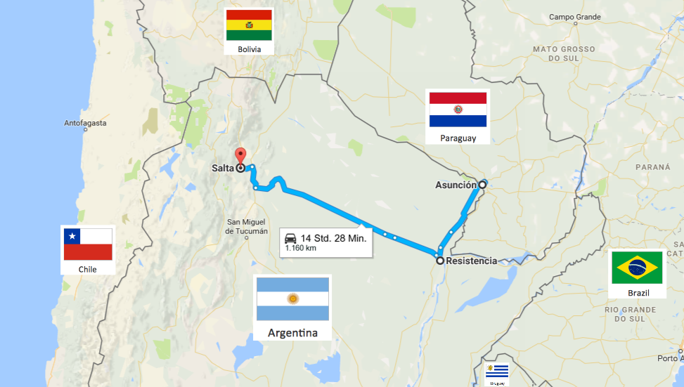 Nach Paraguay bin ich überhaupt erst gekommen, weil ich langfristig von Puerto Iguazu nach Salta im Nordwesten Argentiniens gelangen wollte. Geplant war von Asunción anschließend wieder die Grenze nach Argentinien zu überqueren, grob 300 Kilometer gen Süden nach Resistencia zu reisen und schließlich weitere 800 Kilometer nach Westen zu queren. Das ist zweifelsohne die einfachste und sinnvollste Route, um von Asunción an mein Ziel zu gelangen.