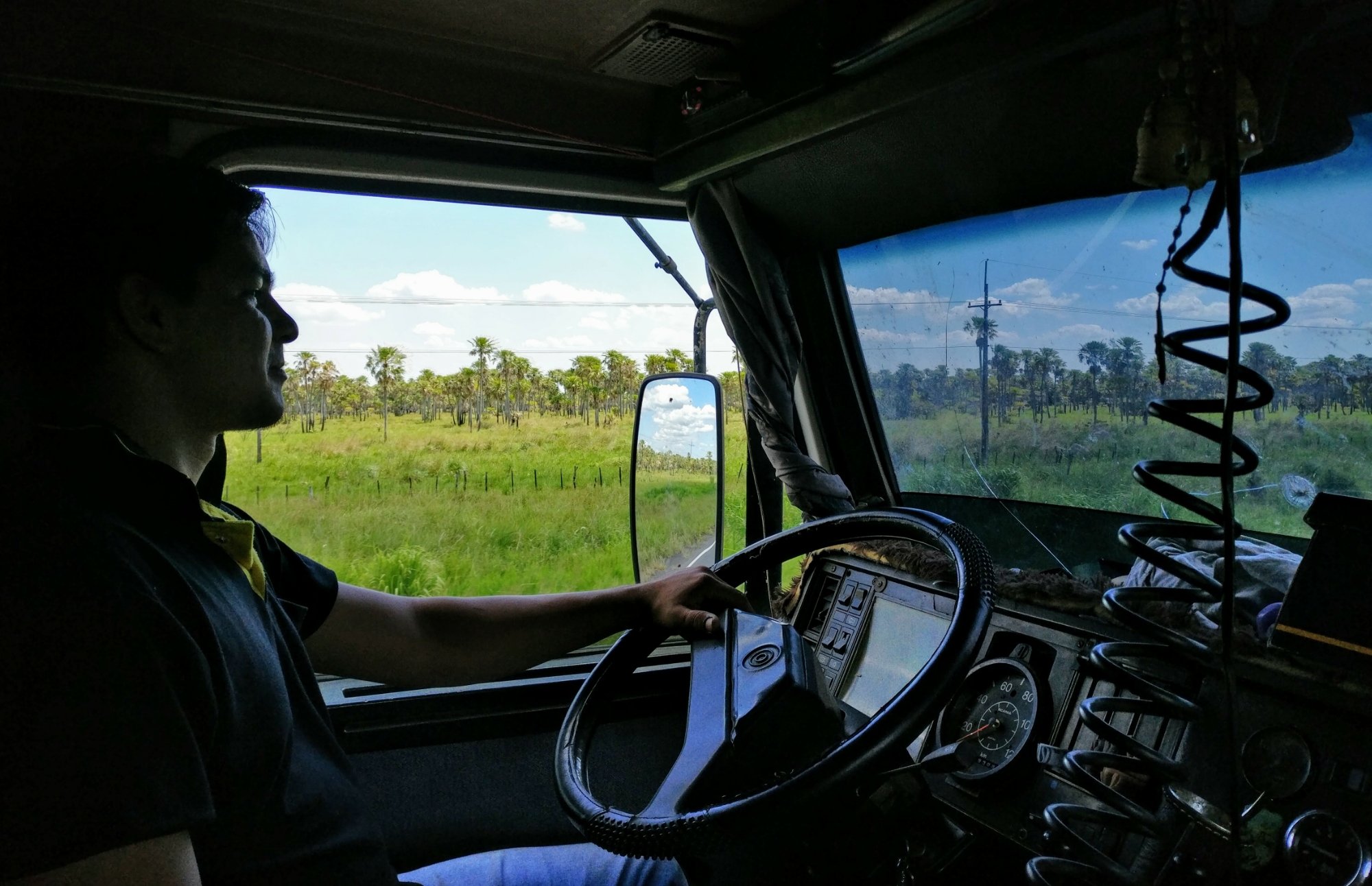 Als ich im LKW Platz nehme, steigt mir ein intensiver Tiergeruch in die Nase, doch ich kann die Ursache dessen nicht ausfindig machen. Der gesamte Innenraum des Fahrerhauses ist mit Fell ausgekleidet und ich entwickele die Theorie, dass mein Fahrer ansonsten immer ein ganzes Rudel Straßenhunde mit dabei hat, die für gewöhnlich meinen Platz einnehmen. Mein Platz ist übrigens nichts anderes als ein kleiner Vorsprung. Es gibt für mich keinen weiteren Sitz und von Sicherheitsgurten brauche ich gar nicht erst anfangen. Dennoch habe ich es recht bequem und bekomme die Aufgabe regelmäßig Tereré für meinen Fahrer und mich einzufüllen. Im Prinzip ist dieses typisch paraguayanische Getränk das gleiche wie der Mate. Der einzige Unterschied besteht darin, dass man es nicht erhitzt, sondern mit eiskaltem Wasser trinkt. Bei den extremen Hitzen macht das auch durchaus Sinn.