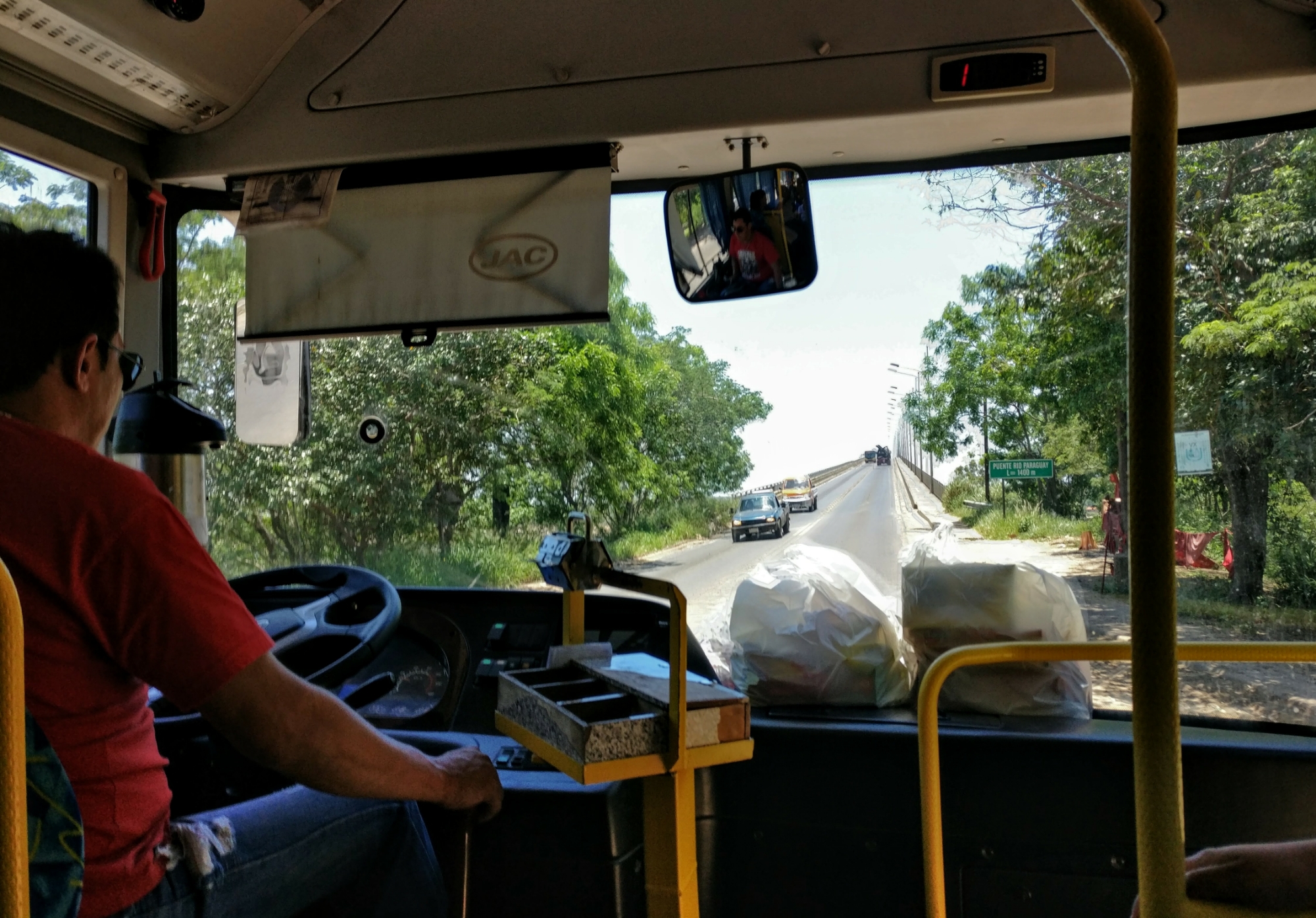 Gut beladen mache ich mich auf den Weg zur nächstgelegenen Bushaltestelle. Ich möchte erstmal ein wenig aus der Stadt rauskommen, bevor ich mich an den Straßenrand stelle. Dazu habe ich das erste Dorf gewählt, dass sich bereits auf der richtigen Straße befindet und nicht mehr zu Asuncion gehört. Ironischerweise ist es gleichzeitig auch das letzte Dorf für hunderte Kilometer. Ich habe Glück und der richtige Bus kommt schon nach wenigen Minuten. Eine Stunde dauert die Fahrt dann, um aus dem Zentrum an den Stadtrand zu kommen.