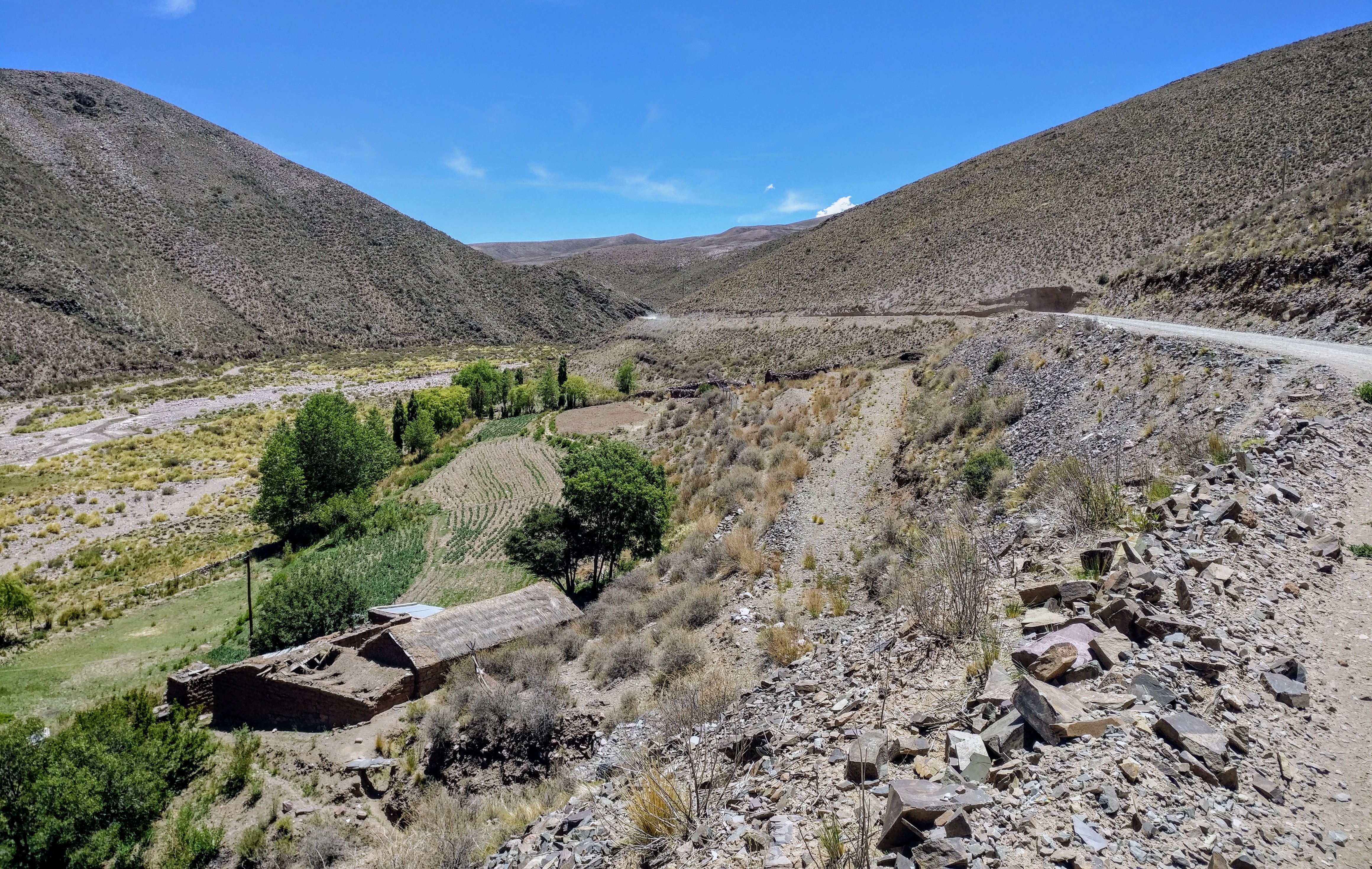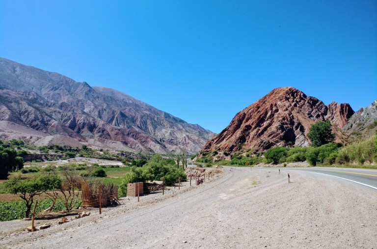 Die Straße schüttelt uns so richtig durch und wir kommen nur langsam voran, aber wir haben unseren Spaß daran. Bereits nach ein paar Minuten kommen wir an einem ersten kleinem Dorf vorbei, Iruya ist es jedoch nicht. Ich weiß nicht wie die das hier machen, aber sie schaffen es tatsächlich in dieser trockenen Einöde etwas wachsen zu lassen und ihre Felder zu bewirtschaften. Vermutlich würde man das Dorf auch gar nicht bemerken, wenn dies sich nicht durch sein grün vom Rest abheben würde. Die Häuser und Hütten sind nämlich aus dem gleichen porösen Gestein gebaut, das sie umgibt, und heben sich farblich überhaupt nicht von ihrer Umwelt ab.