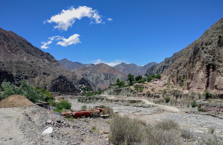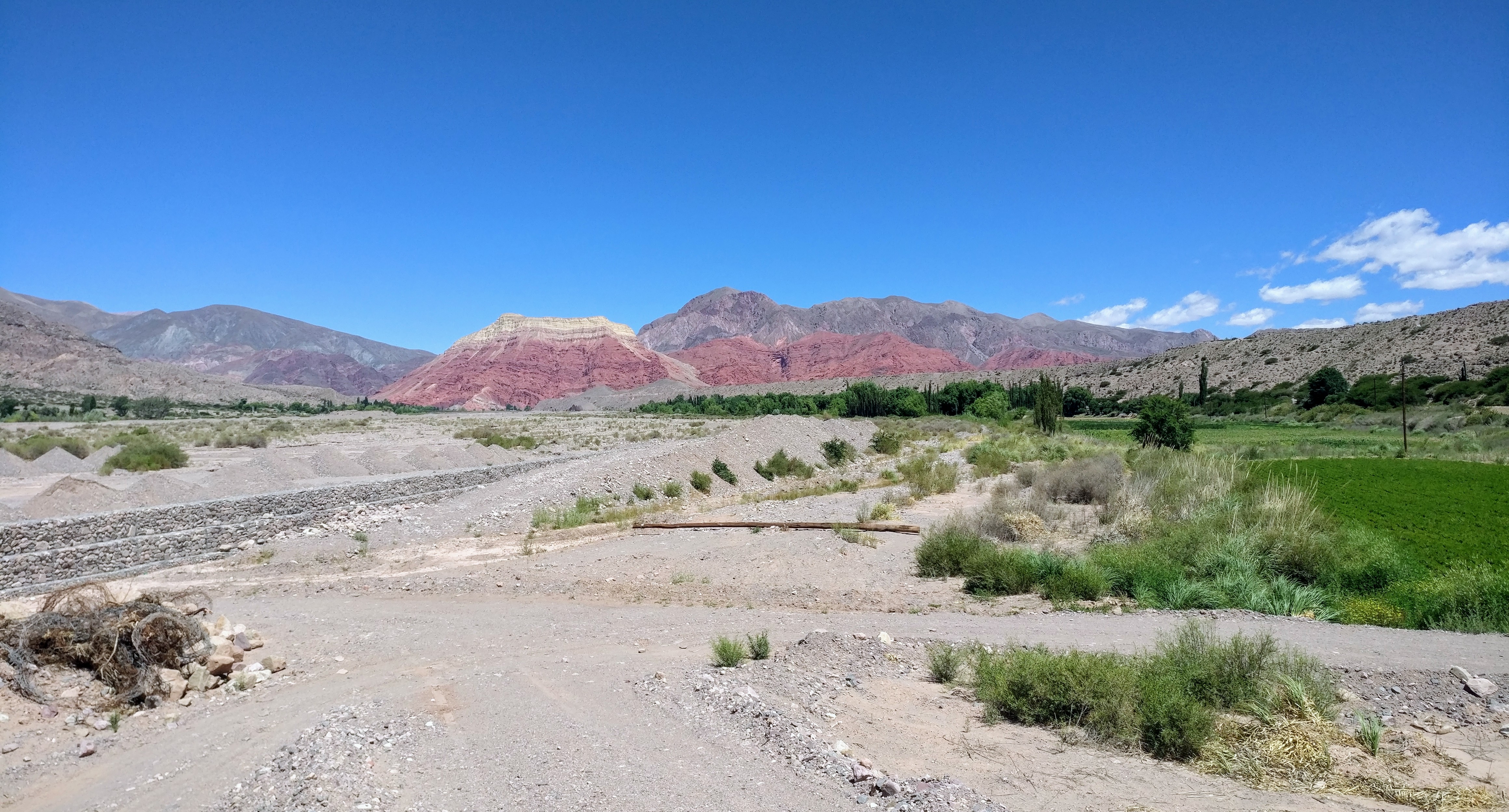 Bei unserer zweiten Pause besteigen wir einen kleinen Kiesberg, um eine bessere Aussicht zu bekommen. Wir haben wieder einiges an Höhe gewonnen und man spürt, dass die Luft so langsam dünner wird. Außerdem wäre es bei diesem Sonnenschein wahrscheinlich deutlich wärmer, wenn wir uns nicht so hoch befinden würden. Hier wird gerade eine große Brücke über das Flussbett gebaut, doch was unsere Aufmerksamkeit auf sich zieht, ist nicht von Menschenhand geschaffen. Wir schauen auf einen Berg, der sich durch sein tiefrote Färbung von allen umliegenden Formationen deutlich abhebt. Auch wenn dies schon länger der Fall war ist es nun amtlich: Willkommen in der Quebrada de Humahuaca.