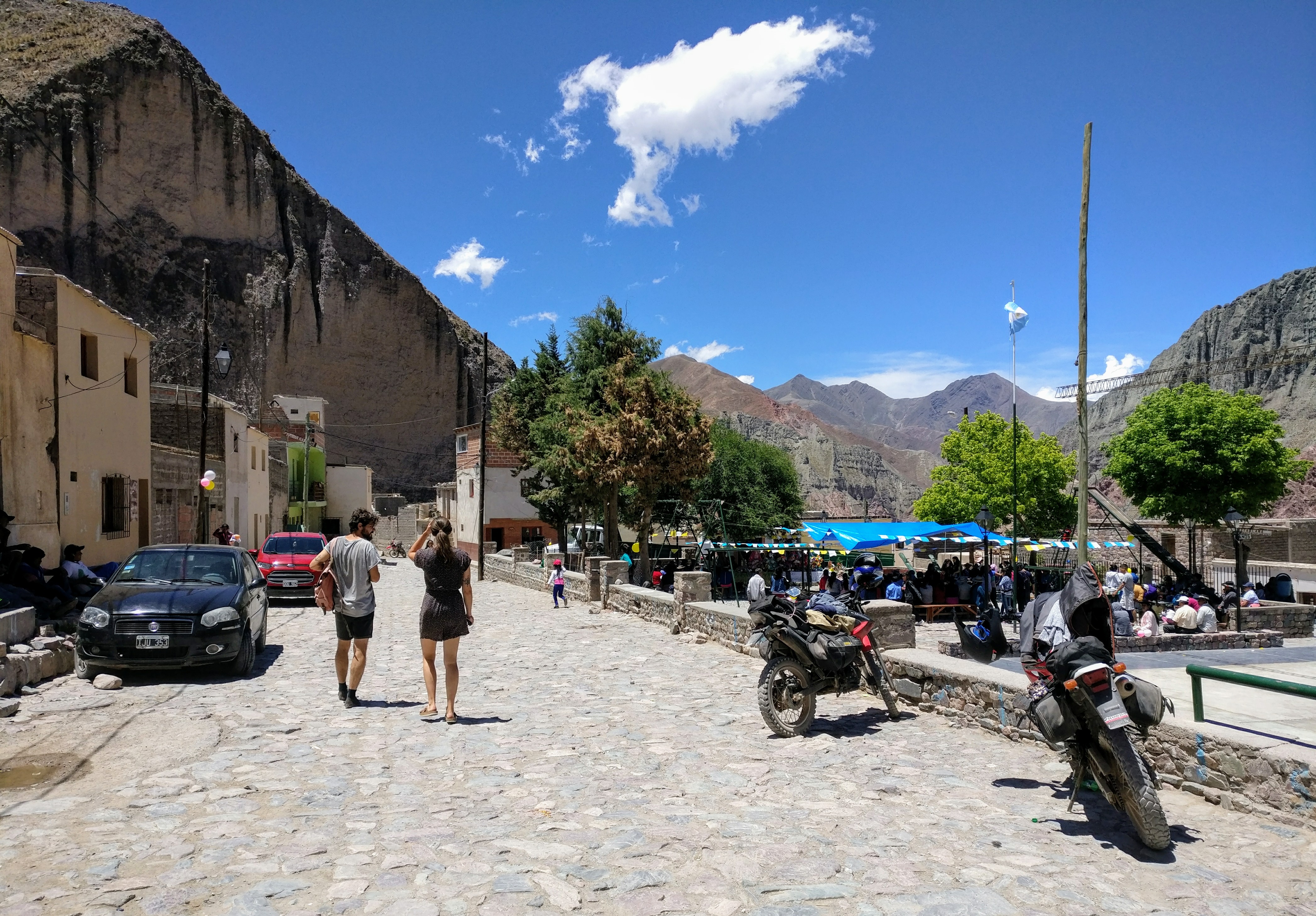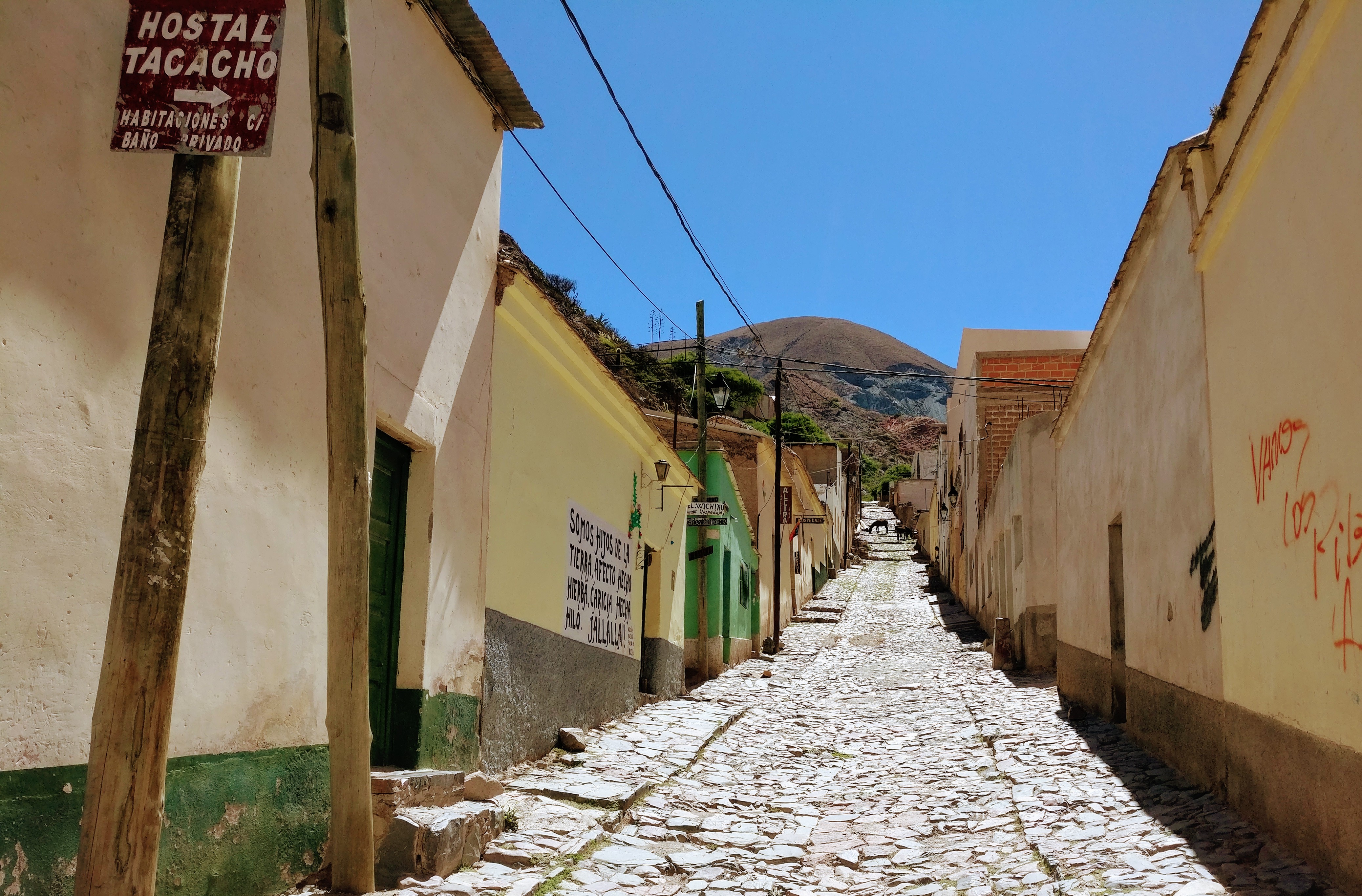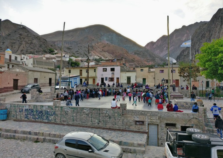 Als wir im Dorf ankommen suchen wir uns einen Parkplatz und drehen eine Runde zu Fuß. Es ist größer und touristischer als ich dachte, aber seinem Flair kann das tatsächlich nichts anhaben. Iruya liegt tief verkeilt zwischen steilen Bergflanken und zieht sich auf beiden seiten des Flusses weit nach oben. Die teils bestuften Straßen und verwinkelten Gassen sind mit großen Steinen bepflastert. Viele Häuser stehen ein wenig schief und vor allem bei deren Türen fällt mir auf, dass diese sehr tief sind. Das hat auch einen Grund.