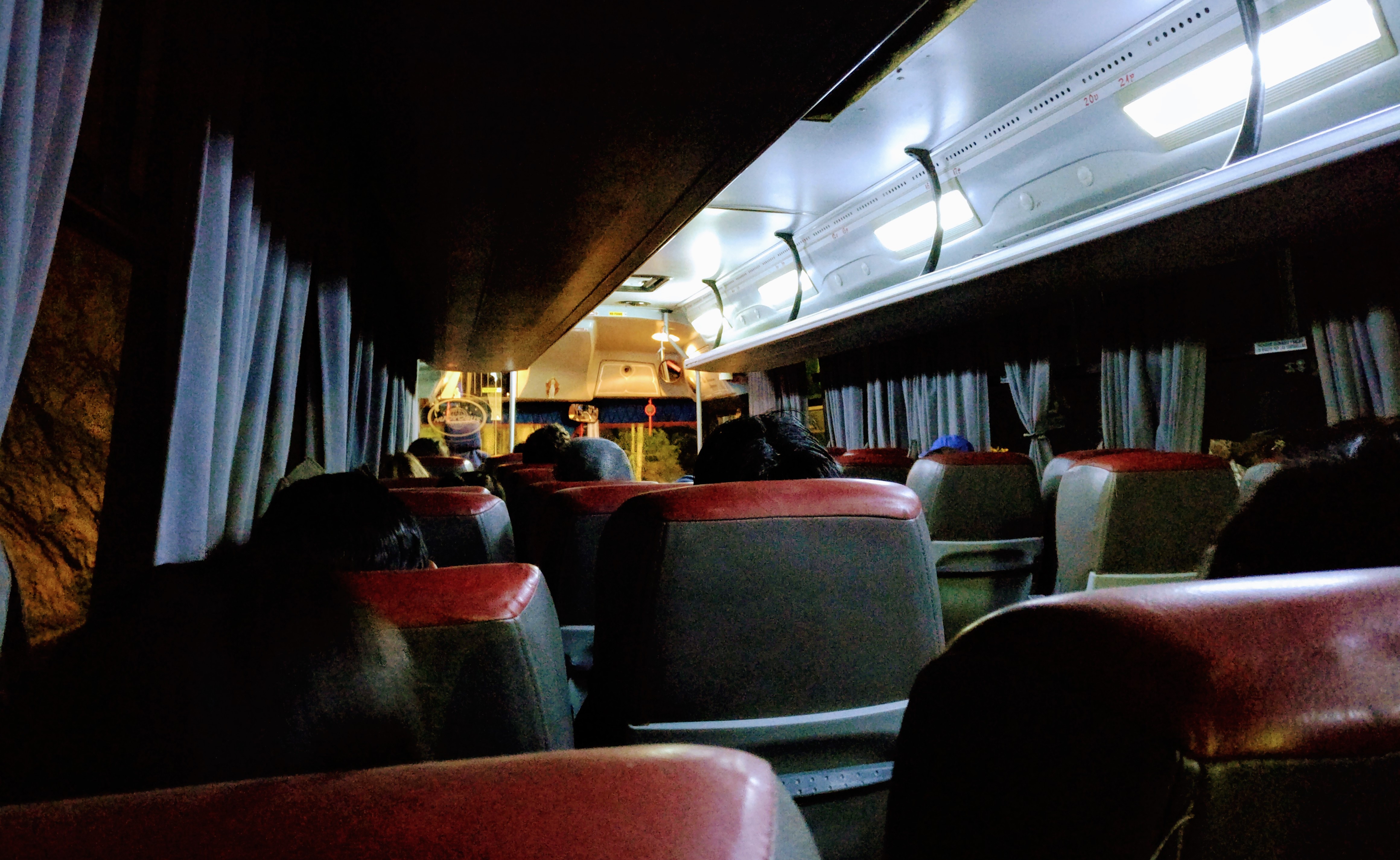 Am Dorfrand wartet der Bus bereits mit laufendem Motor, als ich dort ankomme. Es ist richtig kalt und als ich den Bus betrete sehe ich, dass ich nicht der einzige bin, der sich gut eingepackt hat. So gut wie alle Sitze sind bereits durch dicke Kleiderbündel belegt, aus denen hin und wieder mal ein Gesicht zum Vorschein kommt, an welchen man erkennt, dass die meisten Leute schon wieder ihren Schlaf gefunden haben.