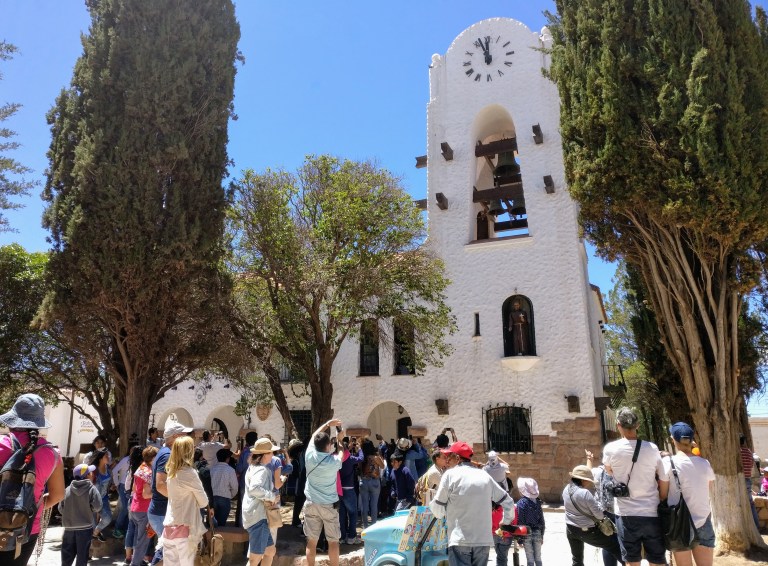Eigentlich finde ich die Stadt sehr schön, doch mein Bild Humahuacas wird durch die ganzen Touristenmassen und den dadurch verursachten Trubel ein wenig getrübt. Vor allem, als ich um kurz vor zwölf zum Dorfplatz zurückkehre, finde ich dort eine riesige Menschenansammlung vor. Grund dessen ist die Kirche aus dessen Fenster um Punkt zwölf Uhr ein automatisierter Heiliger hervorkommt und ein paar mal langsam grüßt. Es ist zugegeben nicht besonders spektakulär, aber zu einem Besuch in Humahuaca scheint das wohl dazu gehören. Sollte ich jedenfalls ein zweites Mal hierher kommen, werde ich mir das definitiv nicht nochmal antun.