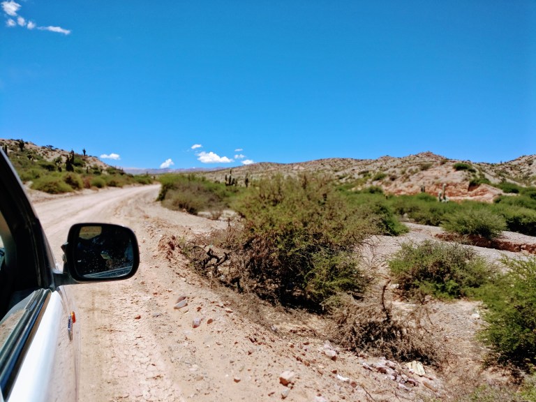 Schnell lassen wir Humahuaca hinter uns und durchqueren eine kleine, mit Kakteen übersähte Schlucht. Danach geht es geradlinig auf den nächsten Berg zu und es beginnt langsam anzusteigen. Nach etwa fünfzehn Minuten befinden wir uns am Fuß der Bergflanke und die unbefestigte Straße zieht sich fortan in Serpentinen den steilen Berg hinauf. Mit zunehmendem Höhengewinnen geht ein deutlicher Temperatursturz einher, sodass wir uns bald alle dazu gezwungen fühlen uns eine weitere Schicht überzuziehen.